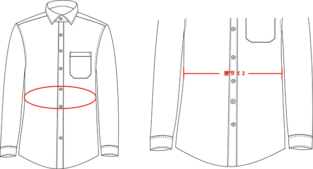 衬衫的腰围测量也需要扣好纽扣,正面平铺。从两只袖隆下到衣服最底部的二分之一处,也是最细的部分开始测量,如图所示: