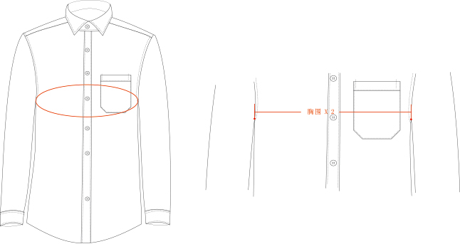 衬衫的胸围测量时扣好纽扣,正面平铺。从两只袖隆最下方的拼接线位置测量,如图所示: